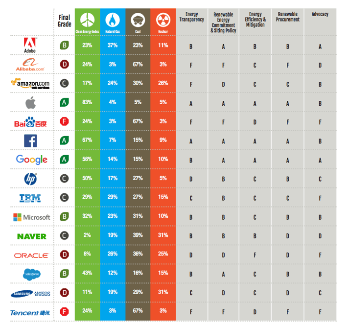 "Both Apple and Google continue to lead the sector in matching their growth with an equivalent or larger supply of renewable energy, and both companies continue to use their influence to push governments as well as their utility and IT sector vendors to increase access to renewable energy for their operations."*