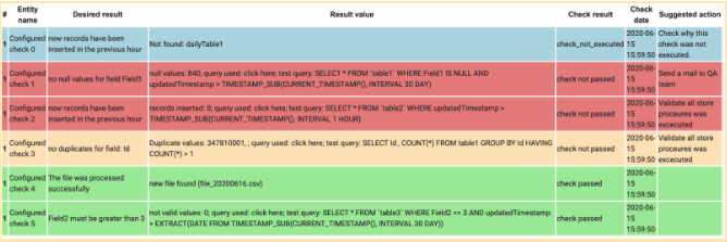 The result value shows relevant information about the result of the check and the query that was executed to validate it. Once we have this information, the query can be copied into a console to check what went wrong easily. The corrective actions can be taken internally by the business who receives the email or resolved by the development team.